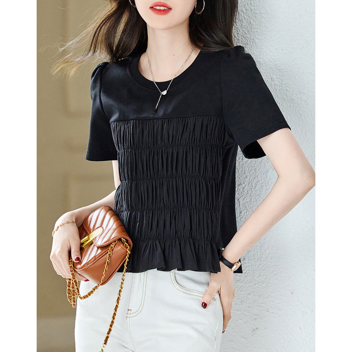 【舒适与造型兼具】夏圆领100%棉短袖t恤泡泡袖拼接女式t恤 560577