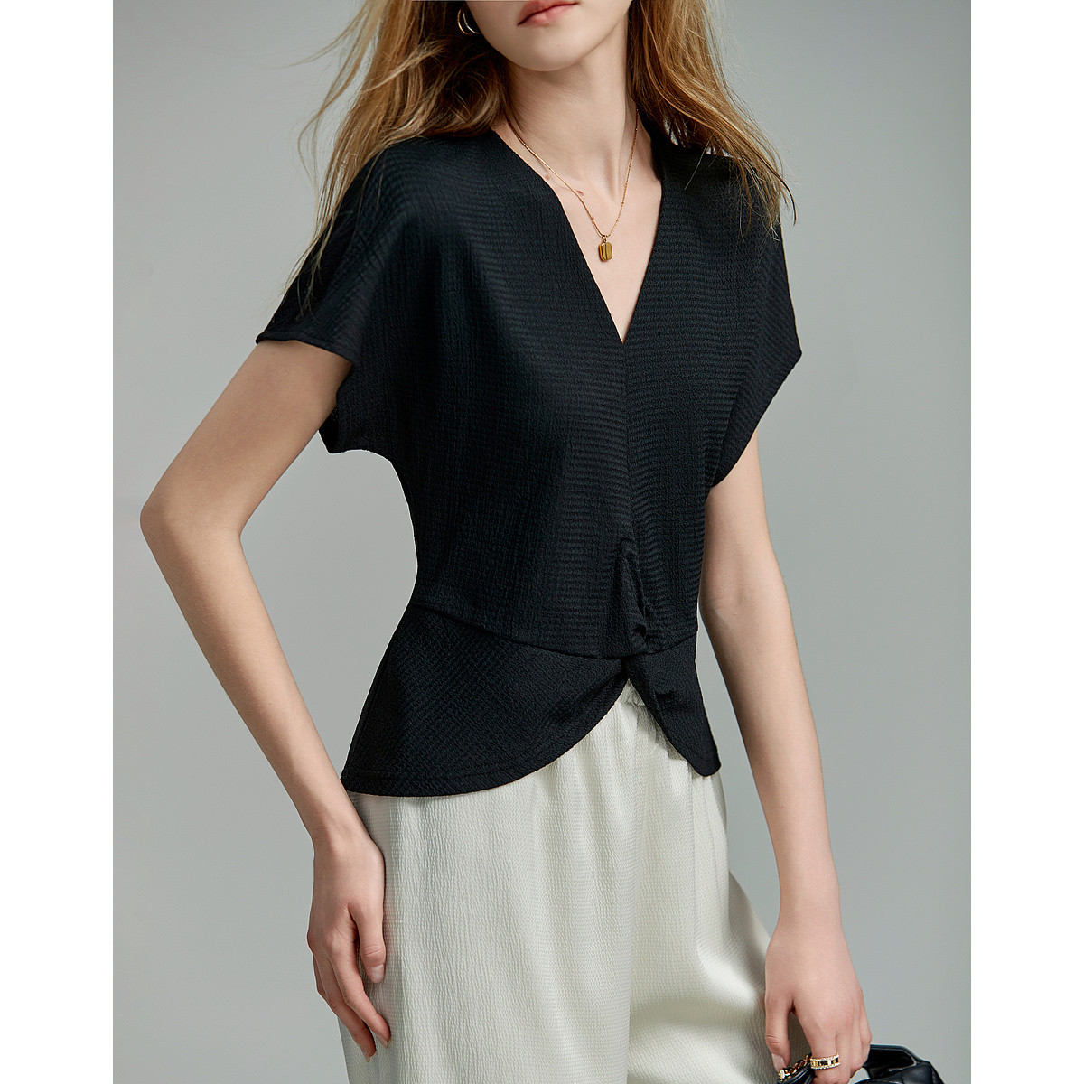 【简约优雅氛围】夏新轻薄V领压褶短袖t恤女设计感扭结女式t恤 549377
