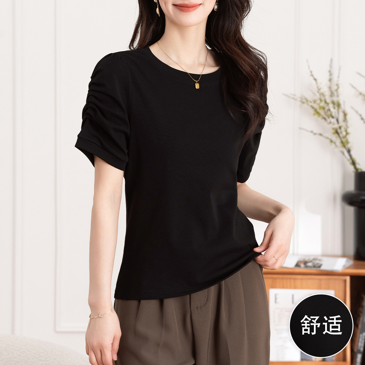 别致泡泡袖纯色圆领短袖T恤女夏季款直筒舒适简约休闲时尚上衣女 299521