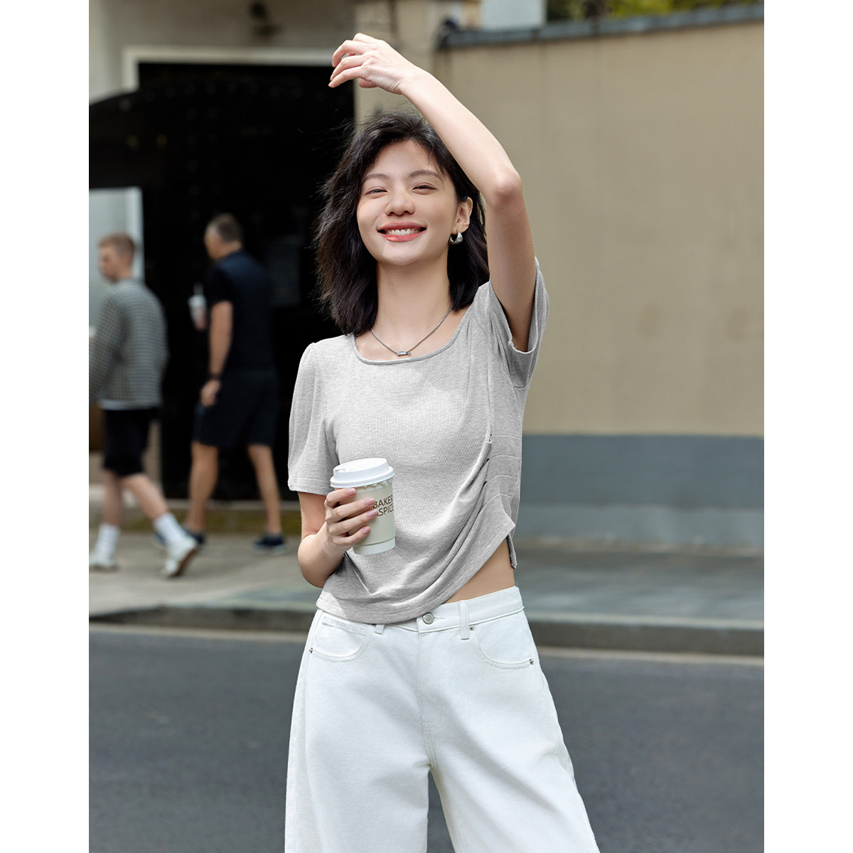 【花灰色泡泡袖T恤】夏方领前片褶皱装饰设计短袖T恤女 998530