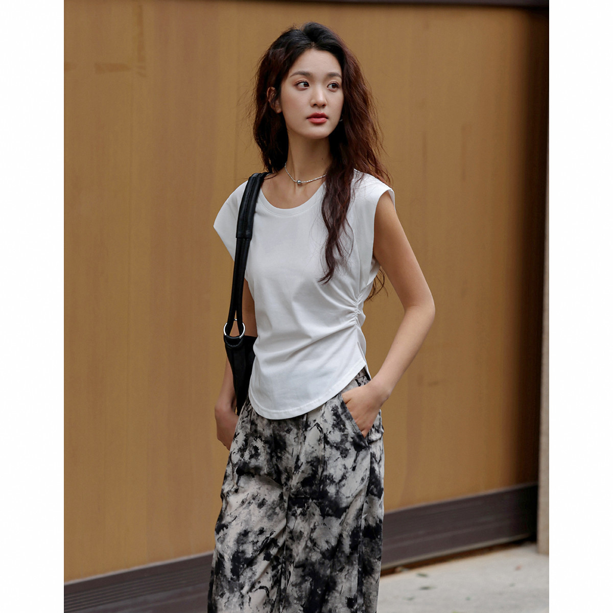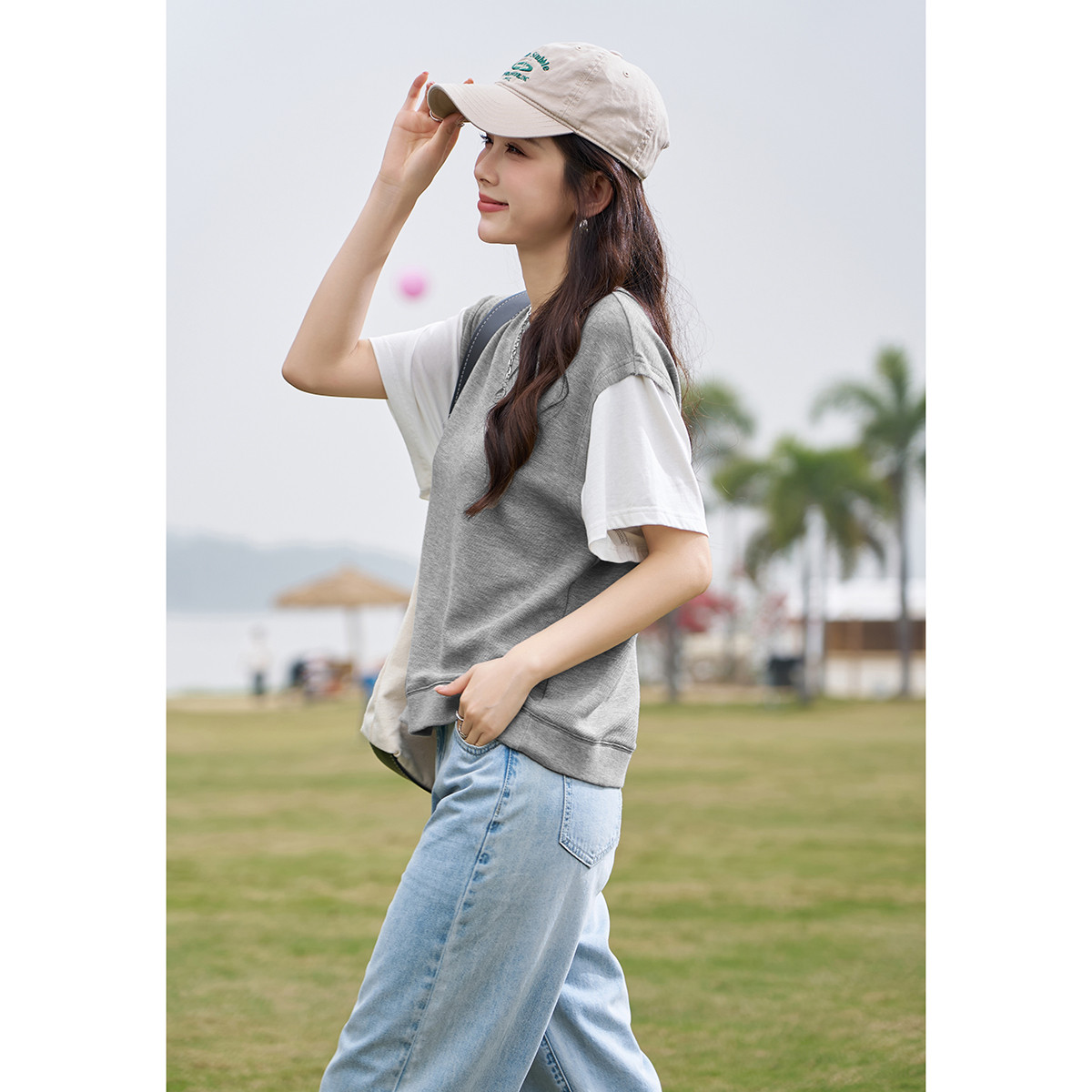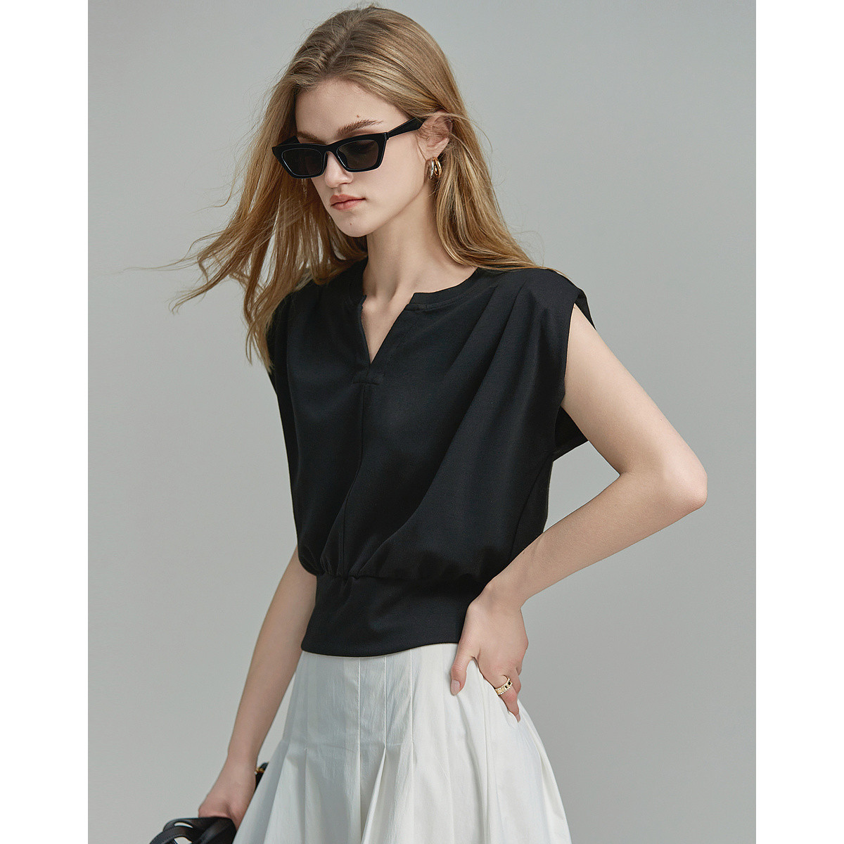 【云柔感空气层】夏简约风V领无袖t恤女垫肩褶裥造型女式t恤 551873