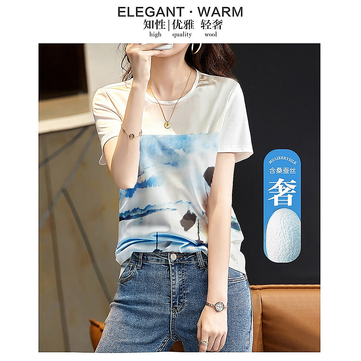 【SPA级舒适】夏季桑蚕丝云氧棉山水印花短袖小个子女式t恤 925121