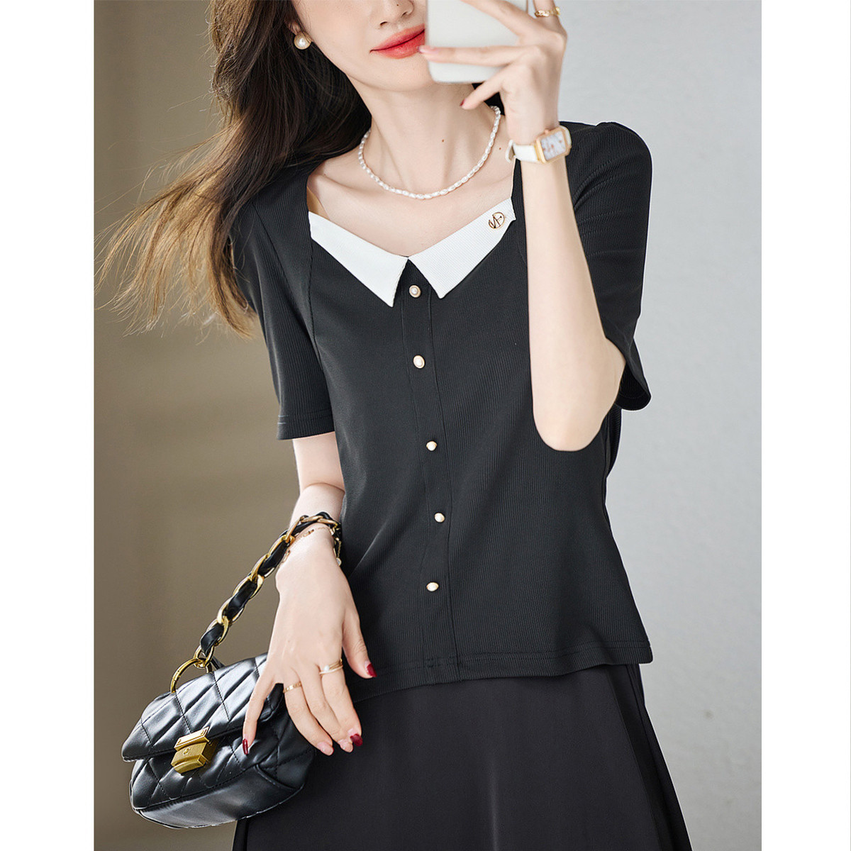 【奥赛罗公主】夏美式甜心方领短袖t恤女泡泡袖拼色针织女式t恤 454081
