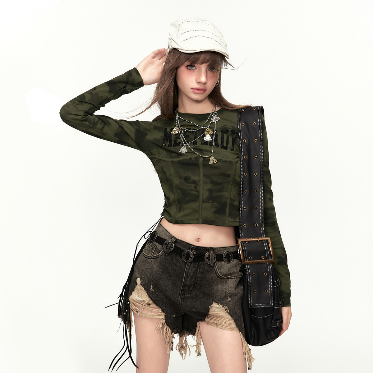 【24春】美式复古晕染迷彩字母印花长袖T恤修身鱼骨短款上衣 456212