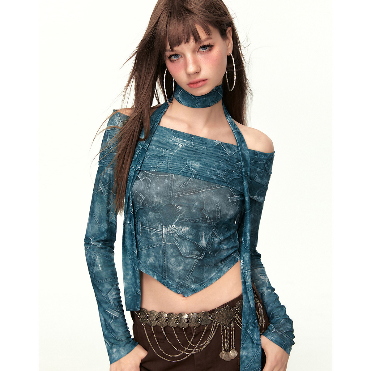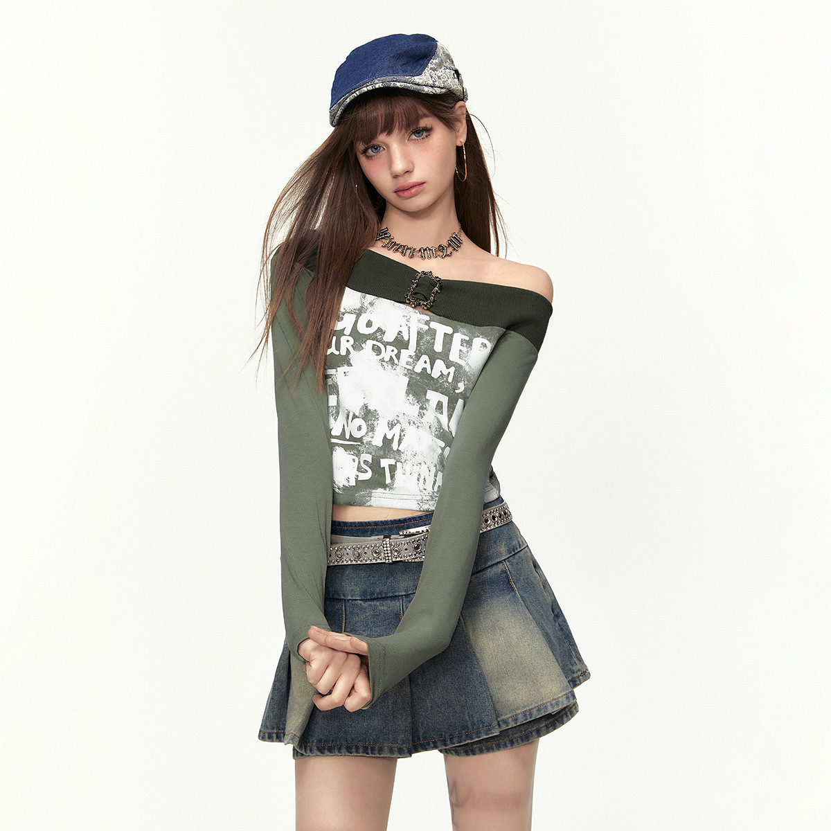 【2024春季】甜酷风印花不规则长袖T恤女一字肩修身打底上衣 284180
