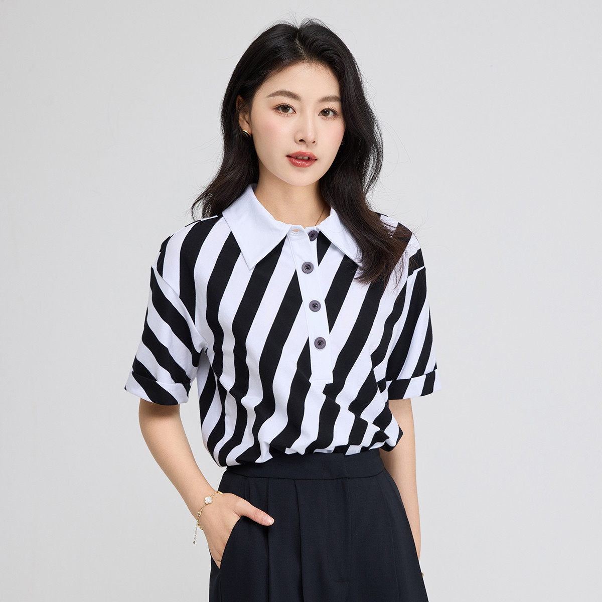 黑白条纹短袖t恤女夏季polo衫宽松别致翻领上衣 911320