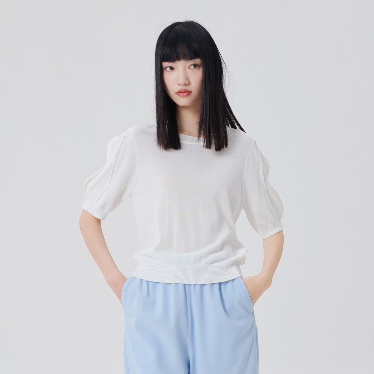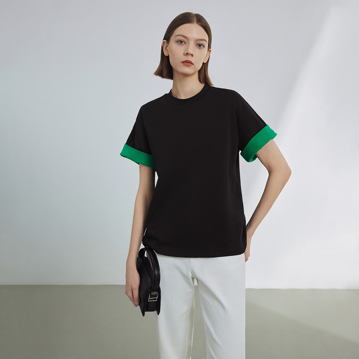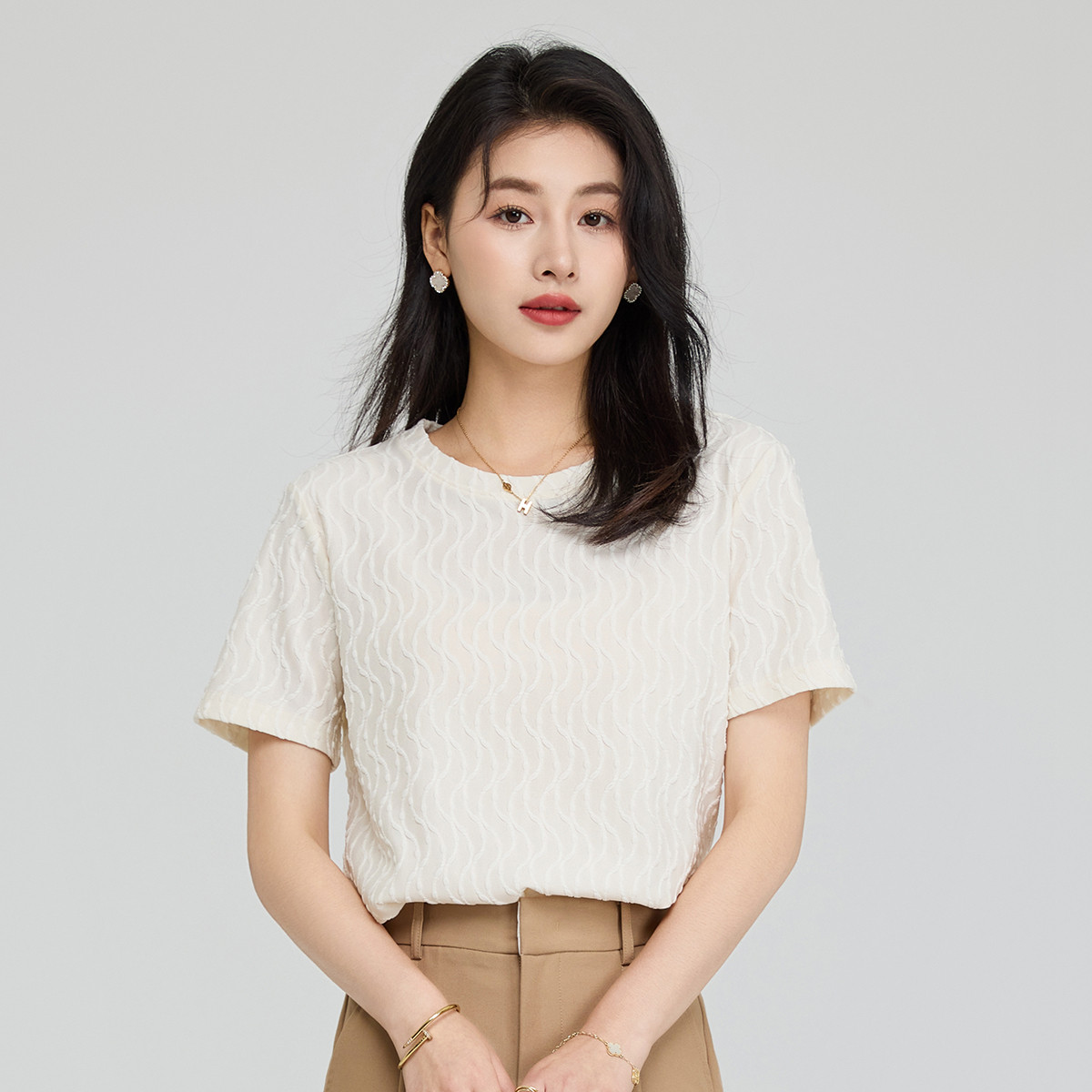 【商场同款】时尚轻薄透气五分袖T恤女短款圆领夏季短袖针织衫 061974