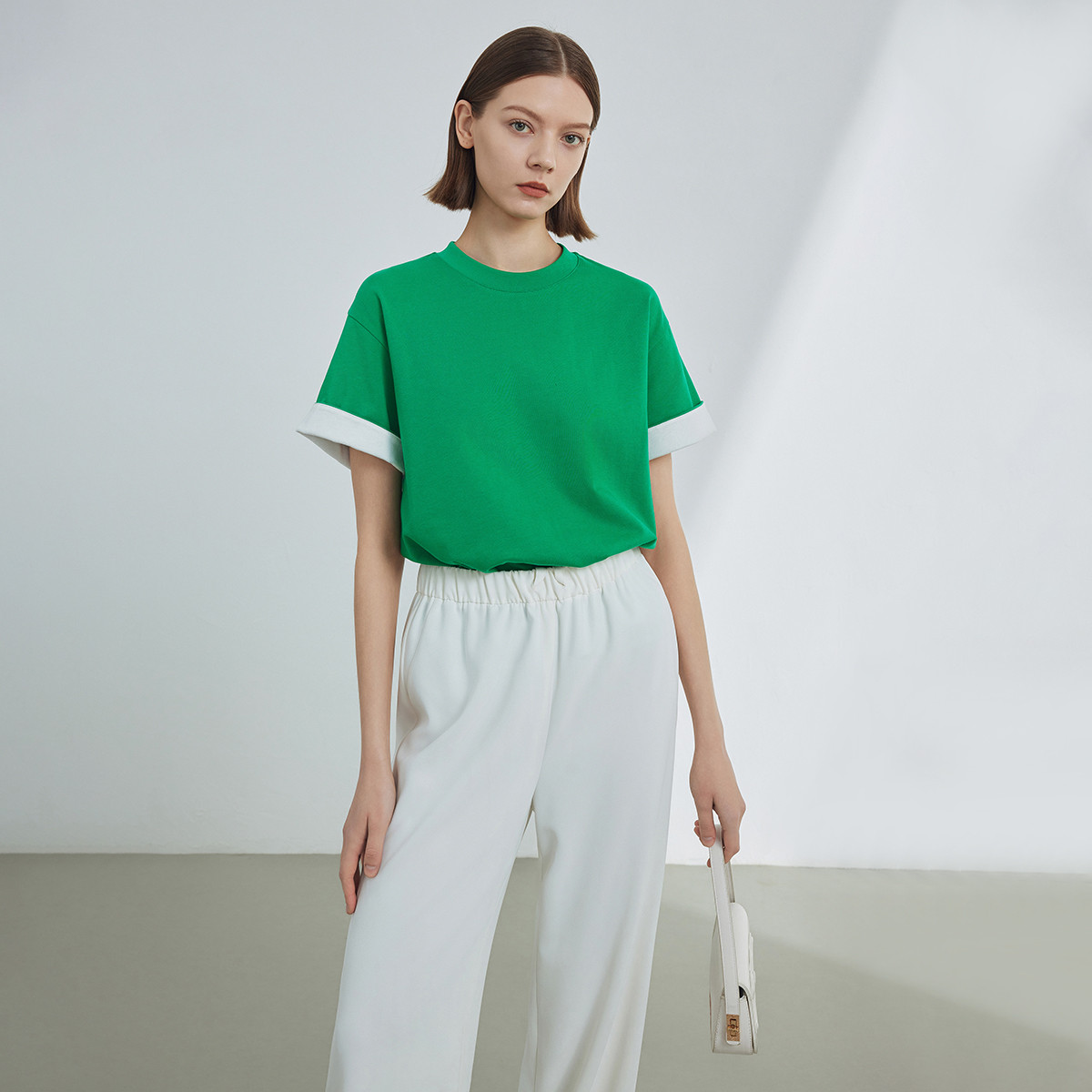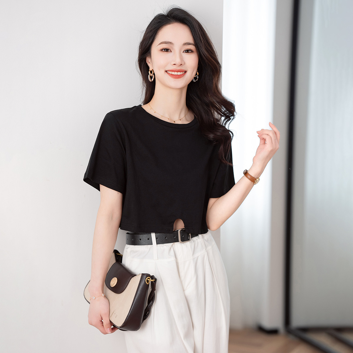 夏季热卖收腰圆领短袖t恤女简约设计感纯色显瘦上衣 083540