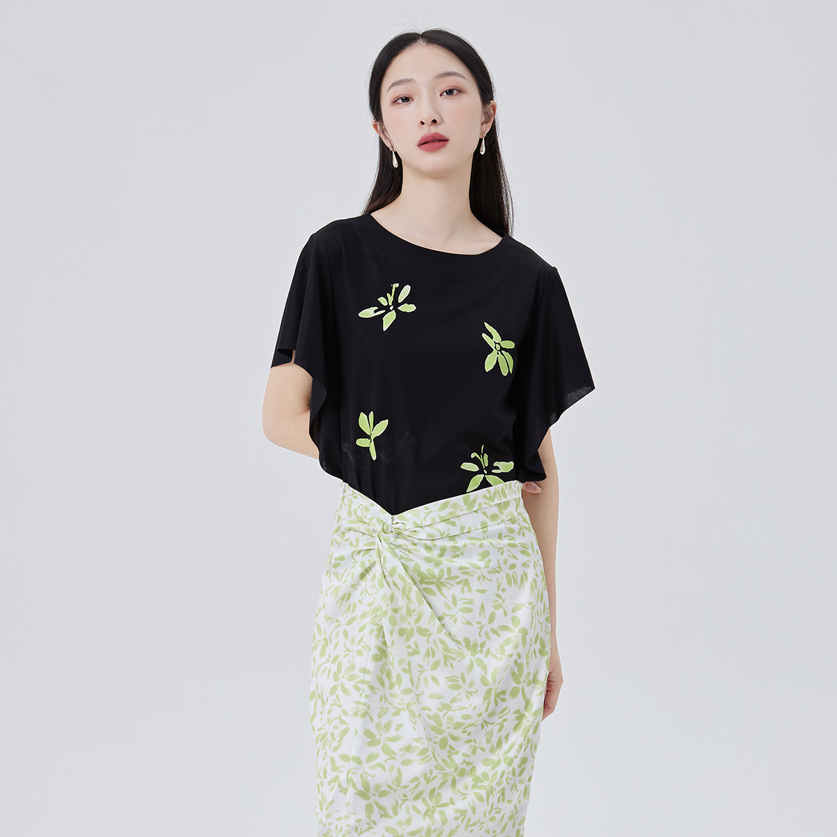 【商场同款】浪漫飞边优雅气质短袖女夏季短款时尚印花女式T恤 057878