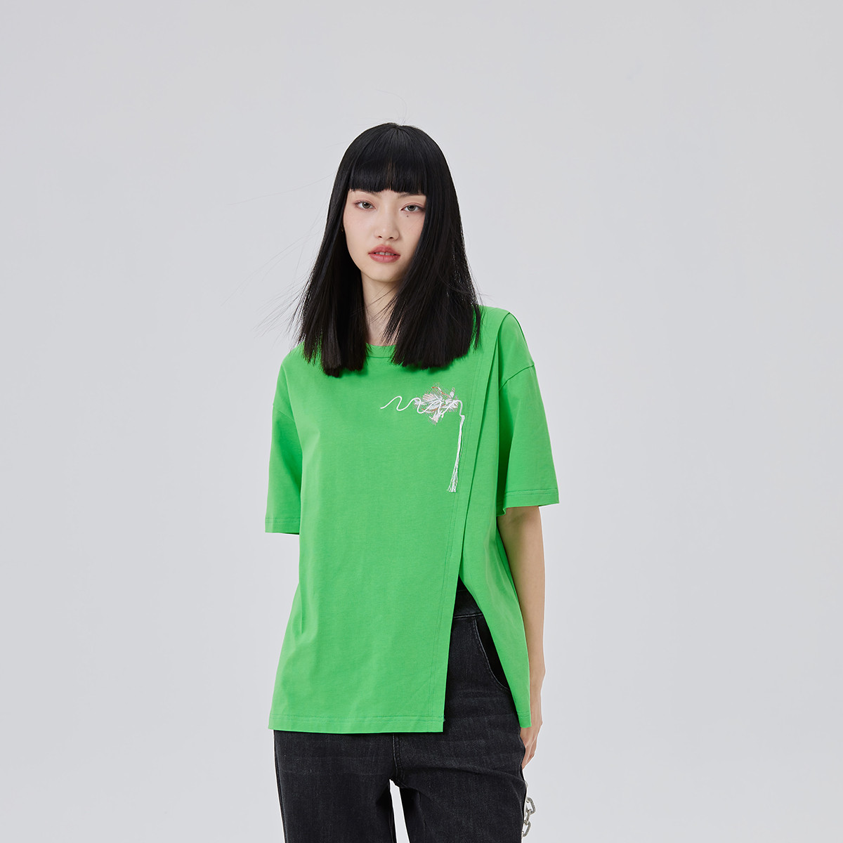 【商场同款】100%纯棉短袖女时尚开衩下摆绣花T恤女中长款 201238