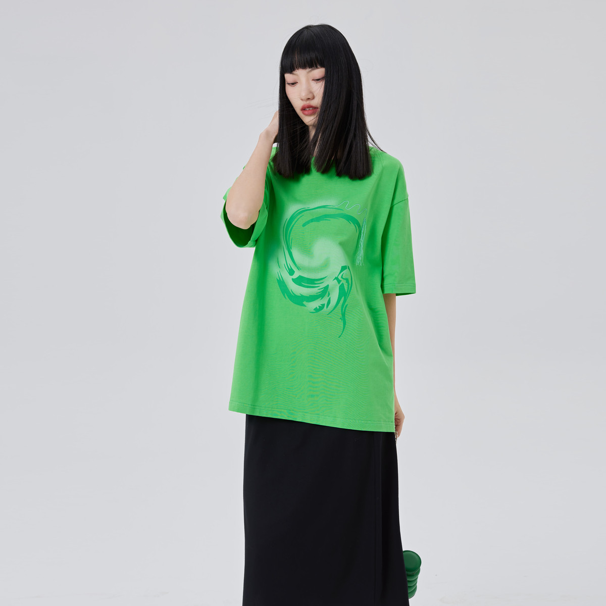 【商场同款】100%纯棉T恤女夏季时尚图腾剪影印花中长款短袖 080854