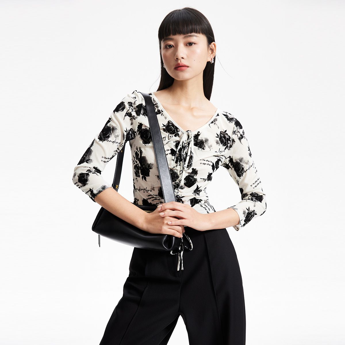 【玫瑰印花】T恤女玫瑰植绒印花修身显瘦时尚减龄V领七分袖 952657