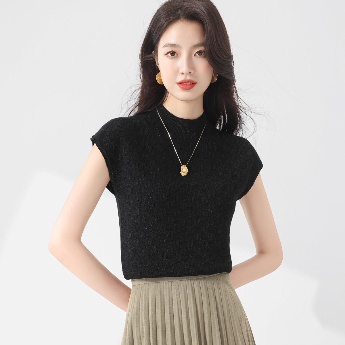 轻薄透气简约百搭纯色高圆领含绵羊毛针织打底短袖T恤 806355