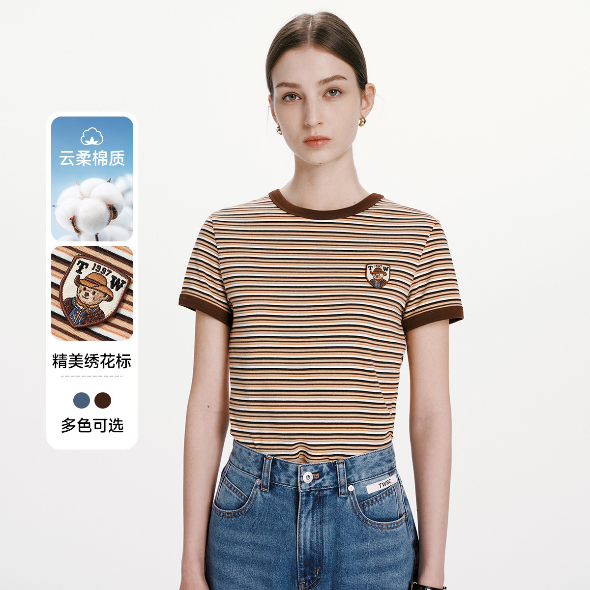 【复古情怀】夏季圆领条纹撞色短袖t恤女刺绣时髦舒适女式t恤 912065