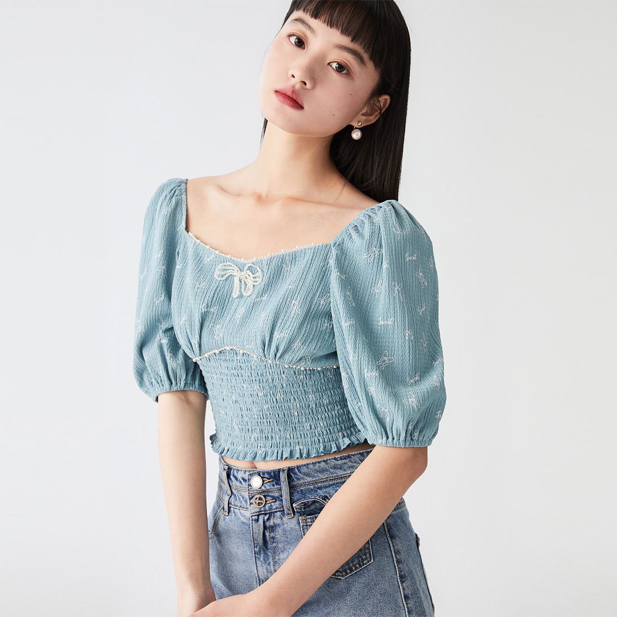 【方领泡泡袖】春夏减龄蝴蝶结印花收腰设计优雅短款T恤上衣女 269073