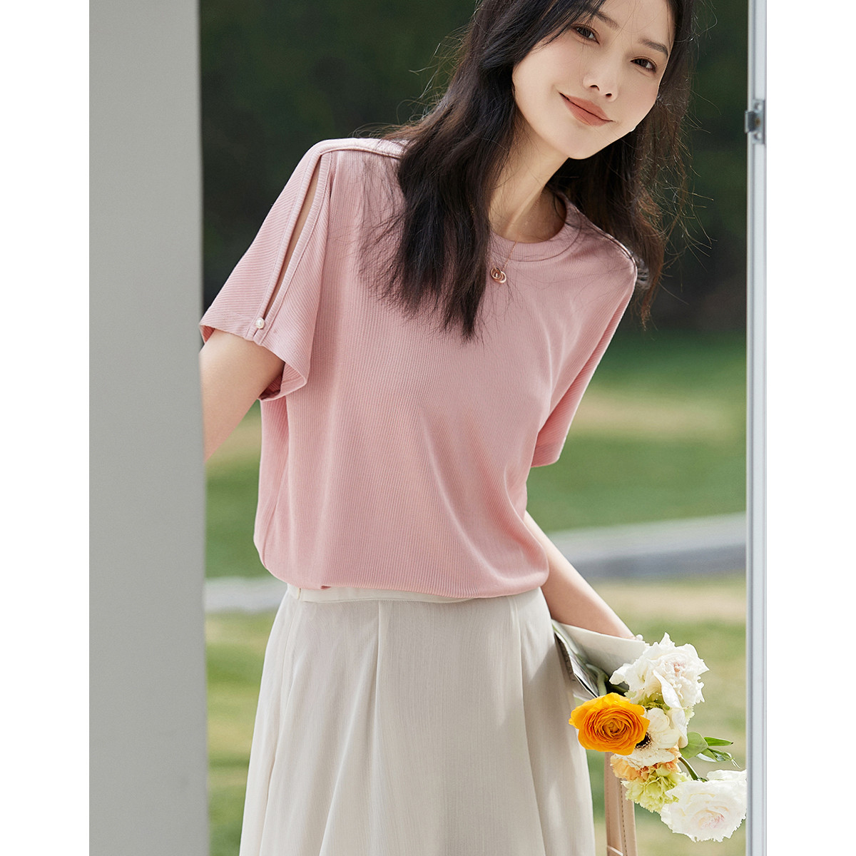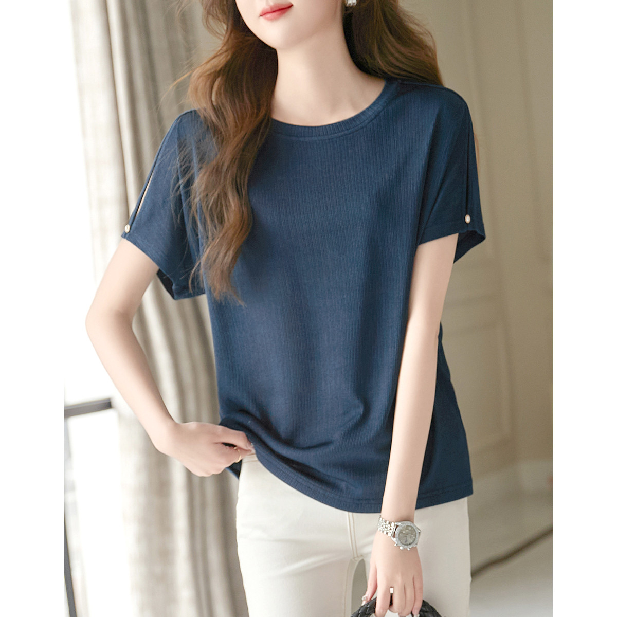 【去繁就简】夏新轻熟风光泽感肌理圆领短袖t恤女连袖露肩女式t恤 518785