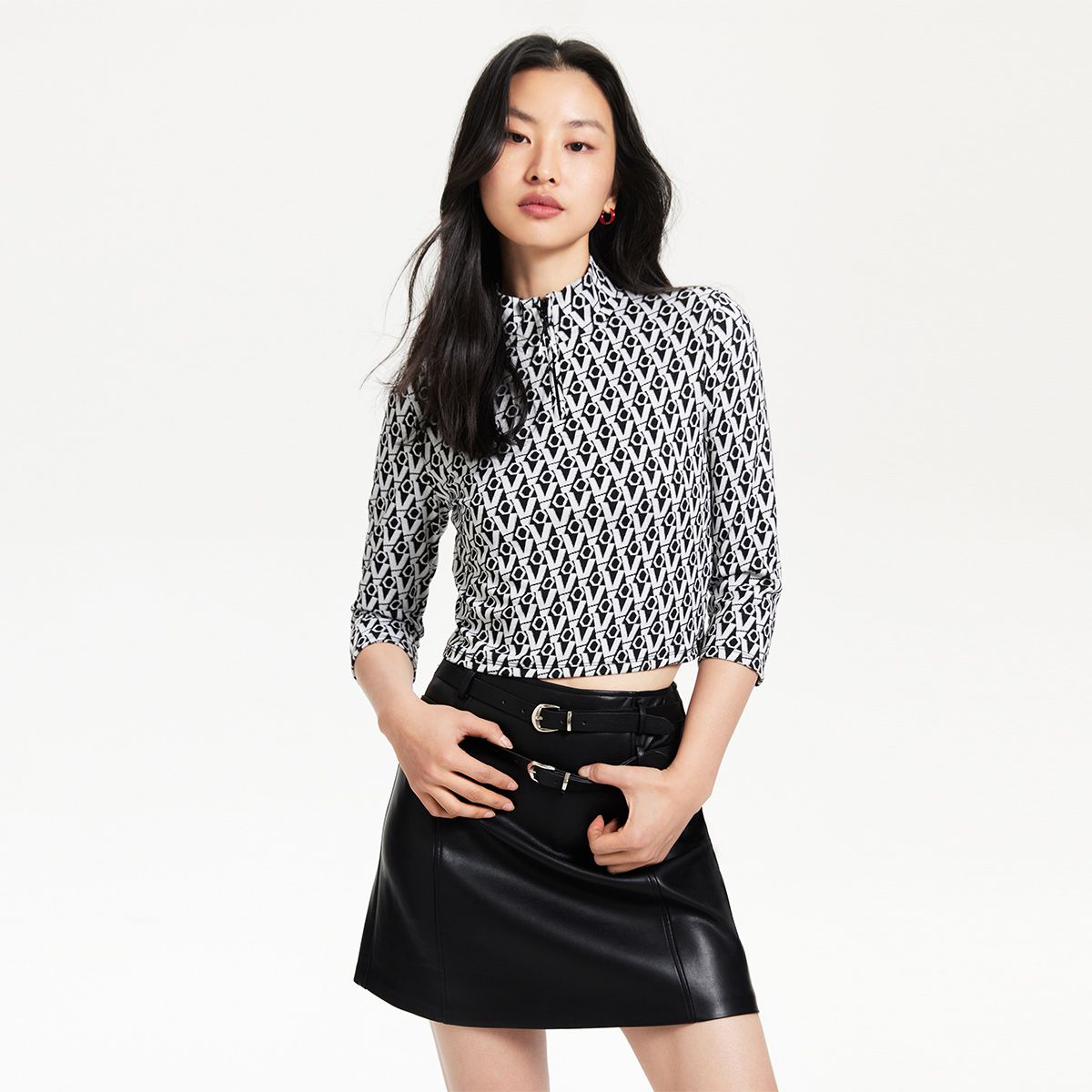上衣女H版型短款立领字母印花七分袖复古 433809