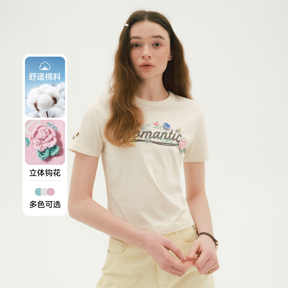 小熊手工钩花圆领短袖T恤马卡龙短款上衣女 473281