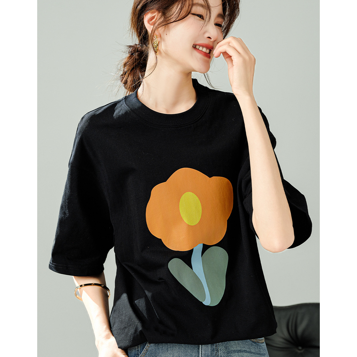 2025夏季韩版发泡印花小花慵懒风休闲百搭圆领落肩短袖T恤女 566345
