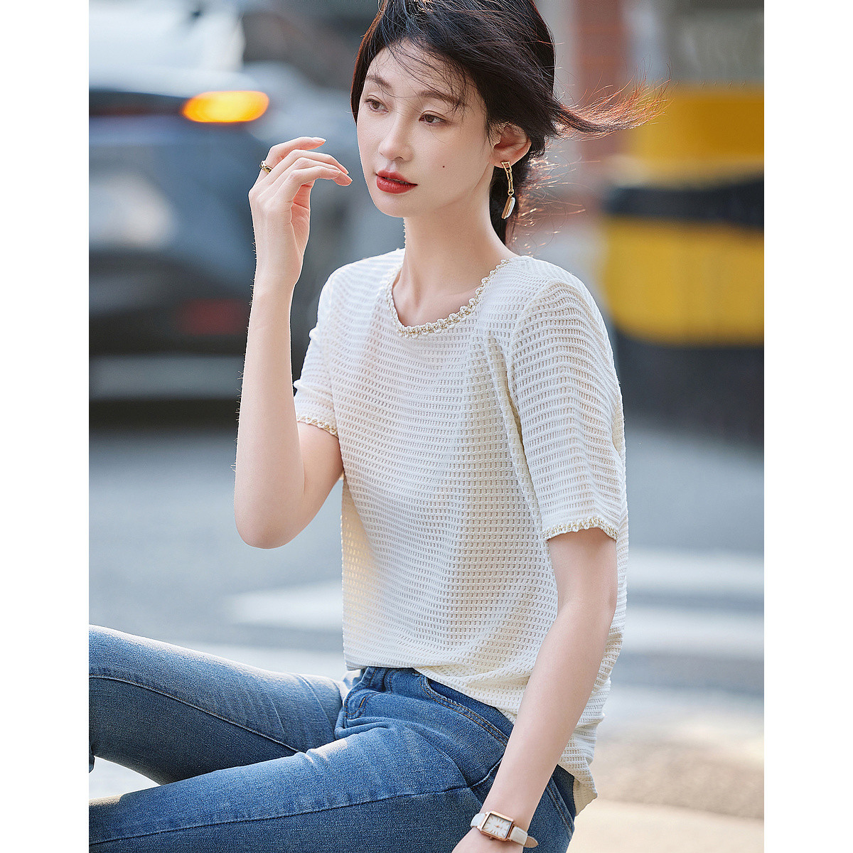 【设计感小众】夏新圆领时髦织带装饰短袖t恤光泽肌理感女式t恤 752321