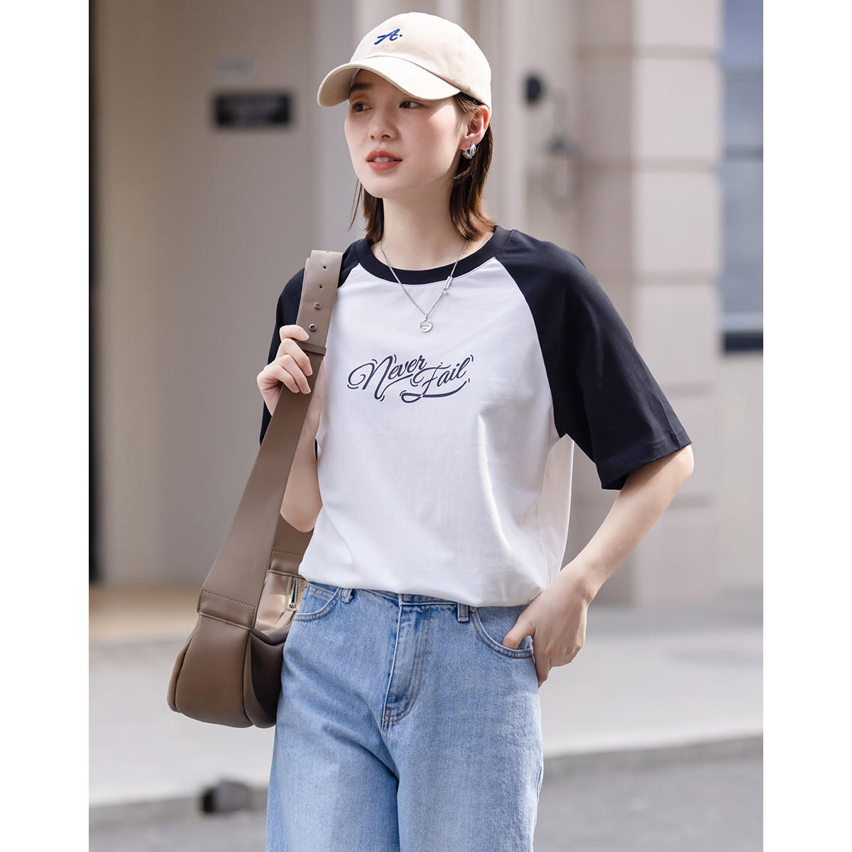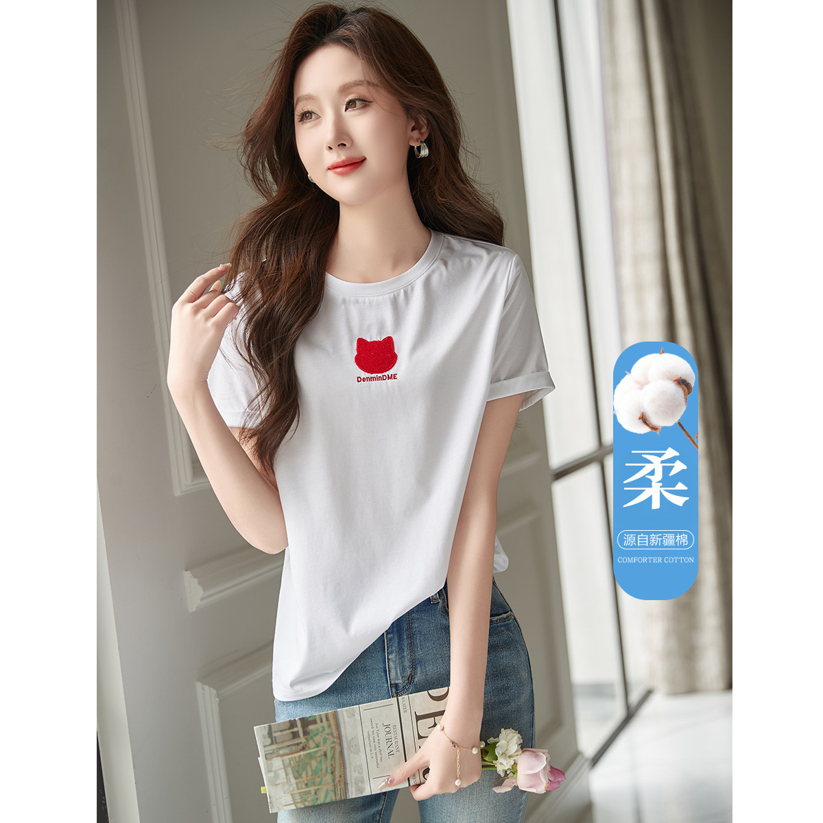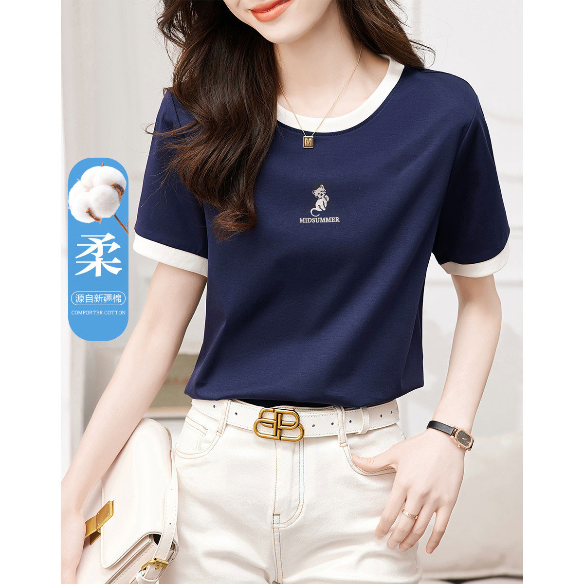 【轻龄衣橱】新圆领字母绣花短袖t恤袖口折边棉氨舒适女式t恤 405697