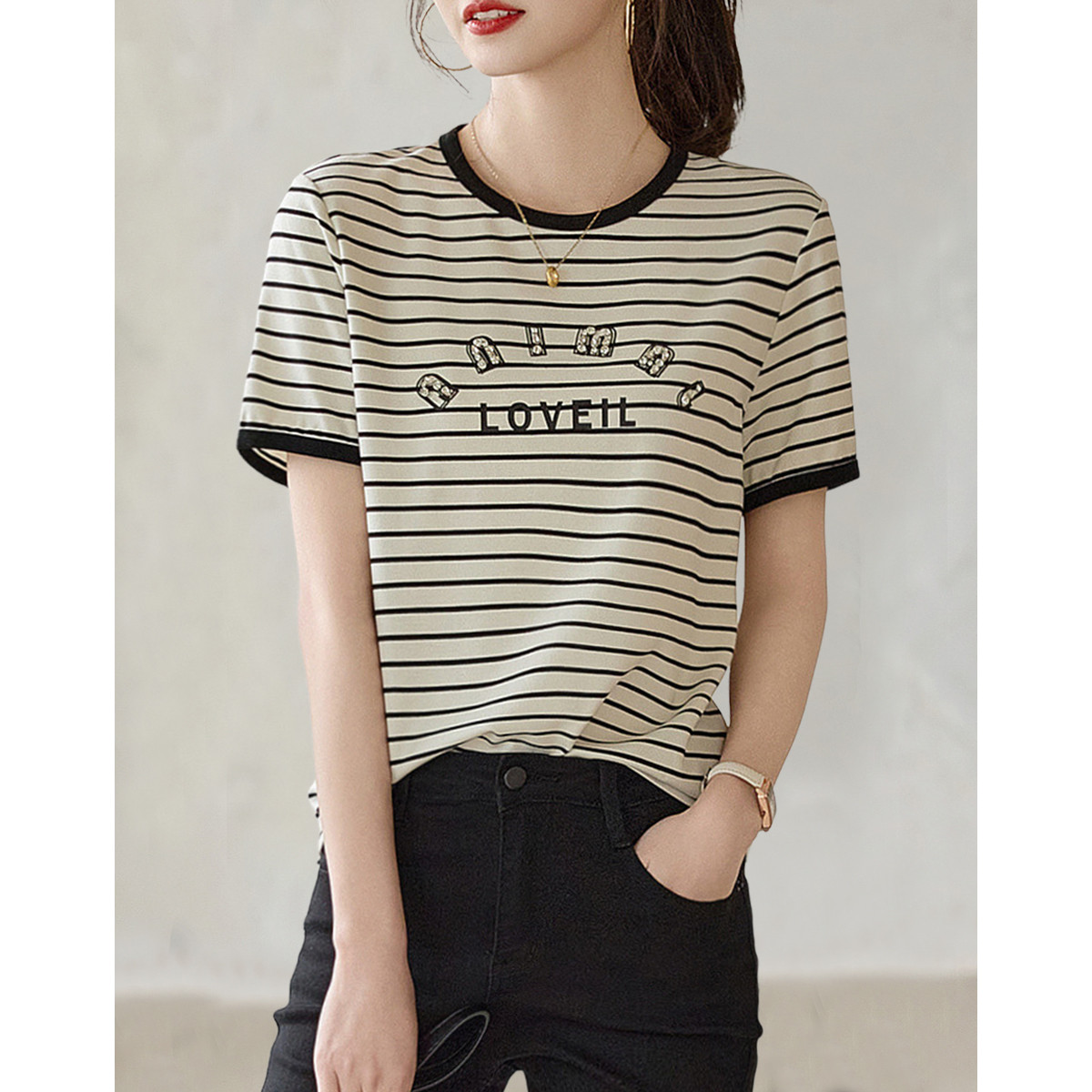 【手工钉钻工艺】春秋圆领短袖上衣罗马色织撞色印花女士t恤 173889