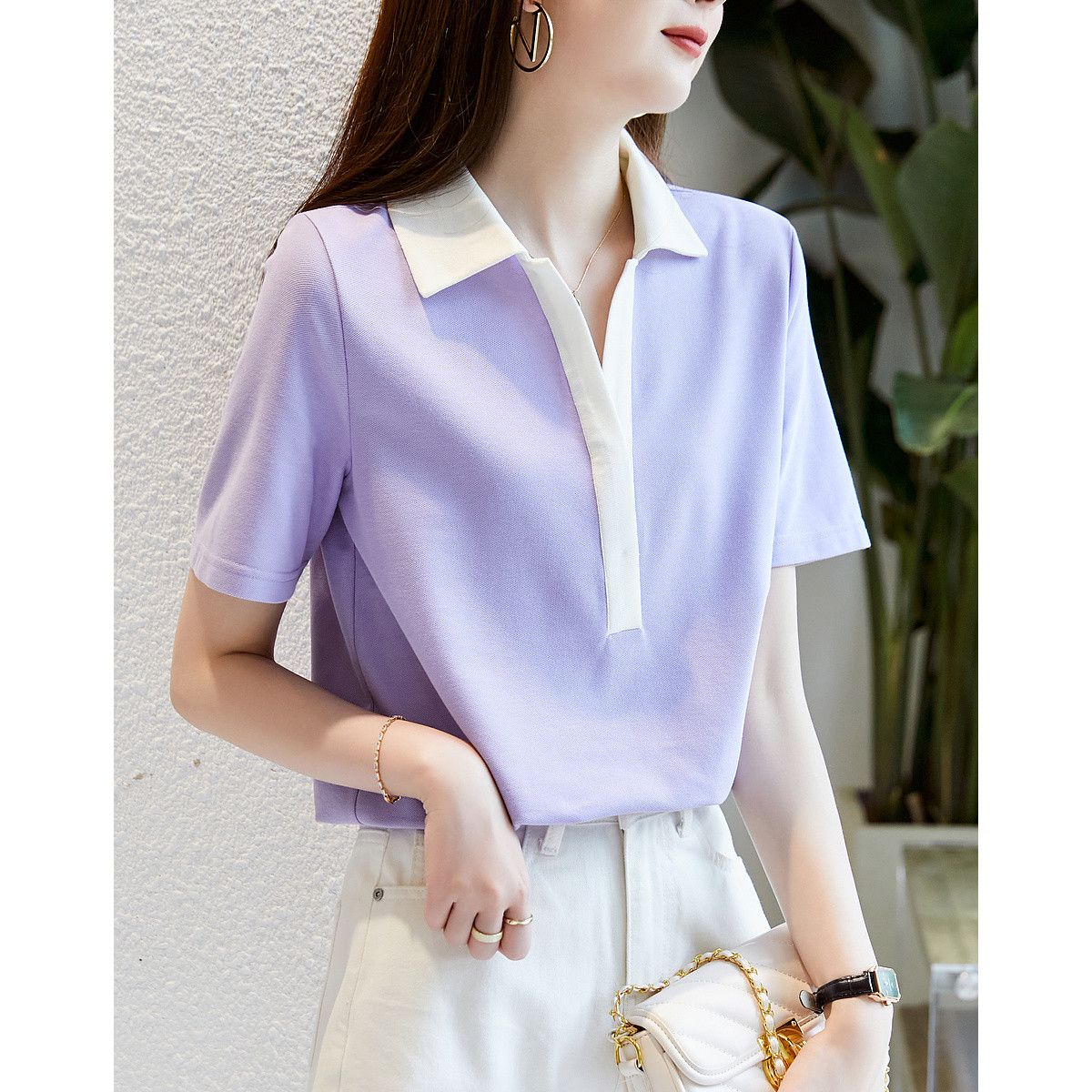 【爽棉珠地女式t恤】夏V字翻领短袖撞色短袖t恤女 401153