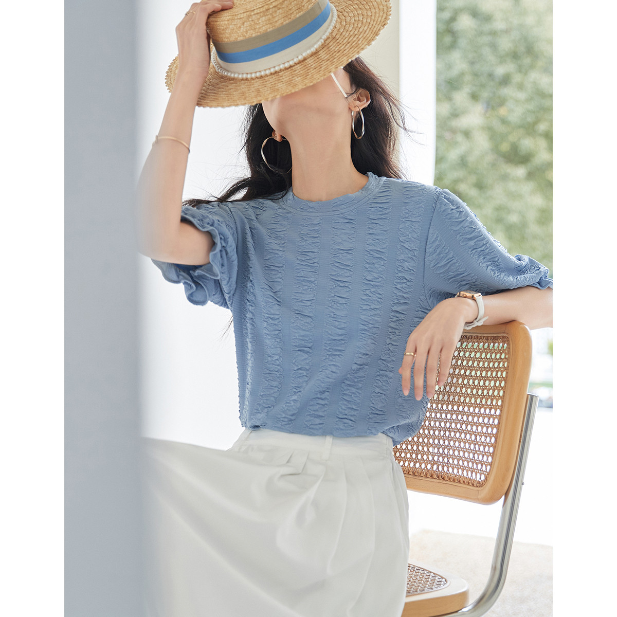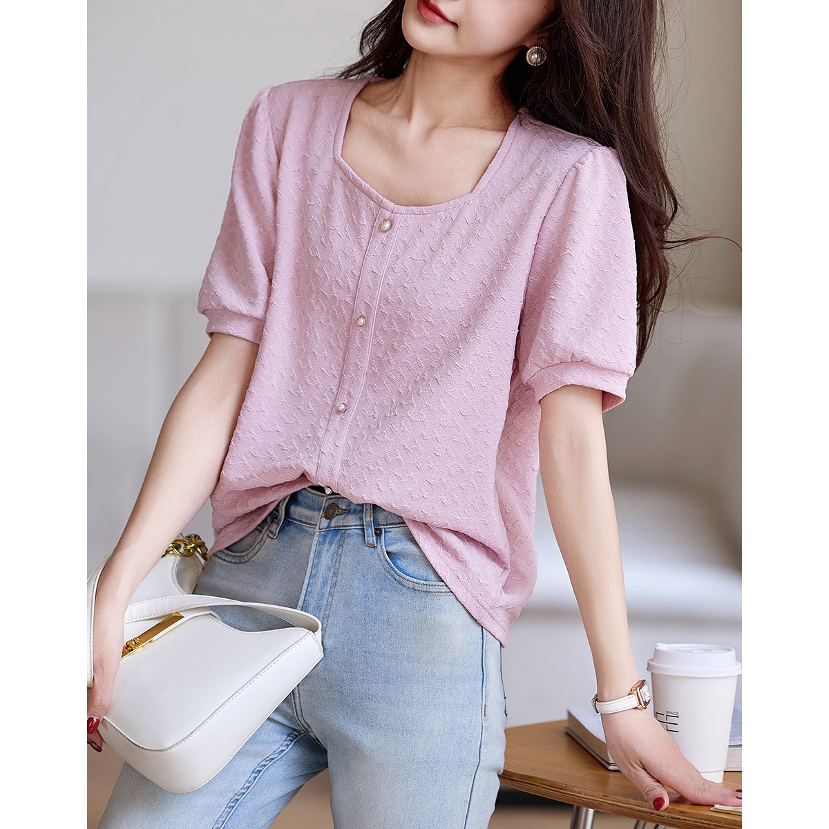 【轻法氧气系列】夏圆领慵懒风泡泡袖t恤女显瘦松弛质感女式t恤 865025