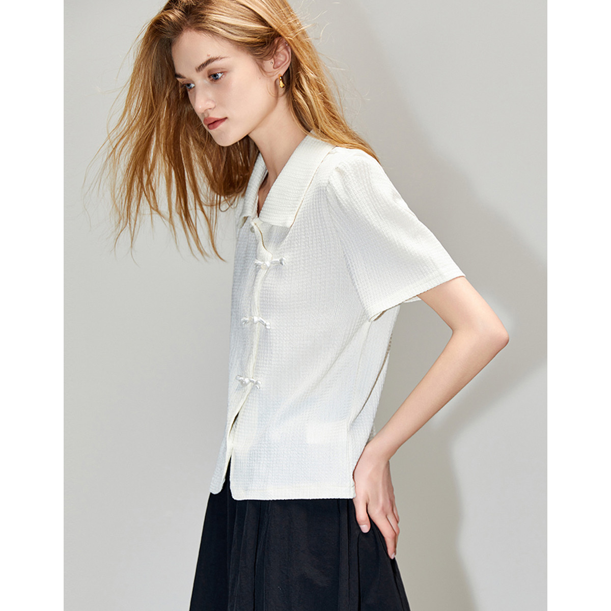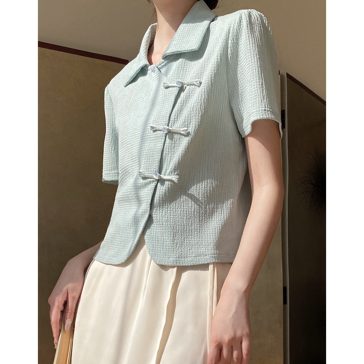 【国风斜门襟新中式】翻领短袖t恤淑女短款泡泡袖盘扣女式t恤 458945