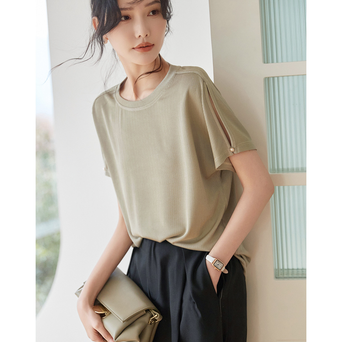 【去繁就简】夏新轻熟风光泽感肌理圆领短袖t恤女连袖露肩女式t恤 694913