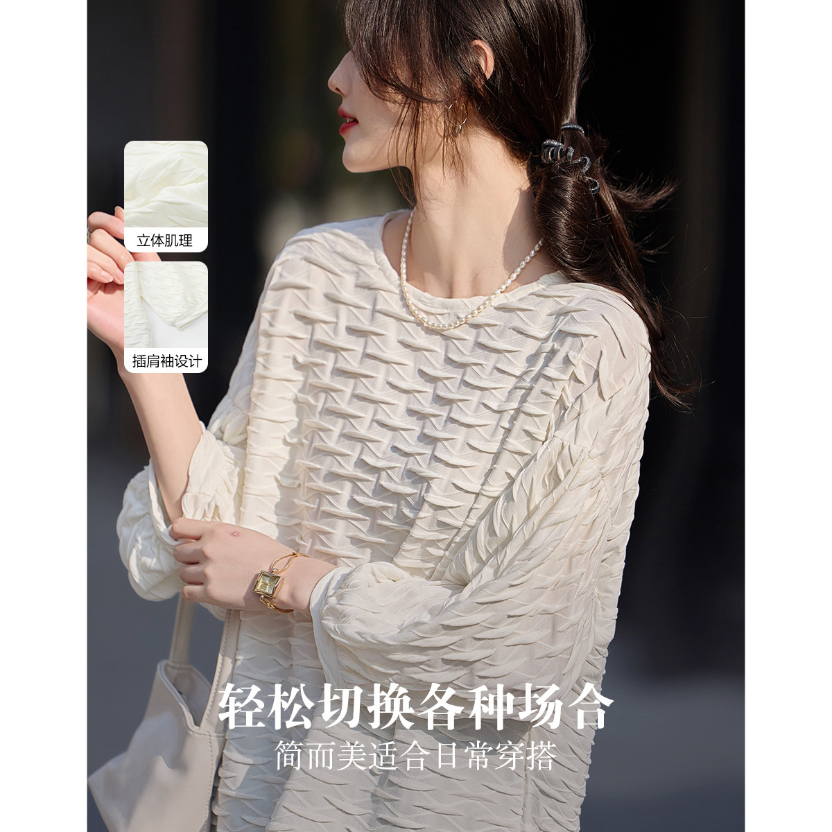 【休闲天花板】春秋圆领九分袖微弹立体肌理感气质舒适卫衣女上衣 645185