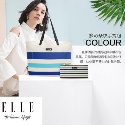 法国 她(ELLE)时尚彩条帆布单肩包钱夹两件套 拼色