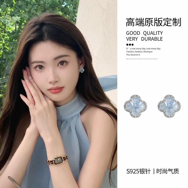 彤彤兔 S925银针蓝色四叶草耳环爆款小清新耳饰女高级感花 朵耳钉