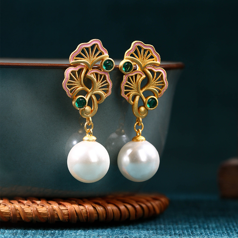 彤彤兔 国潮风古法仿珍珠银杏叶耳钉时尚百搭INS轻奢中古款耳饰