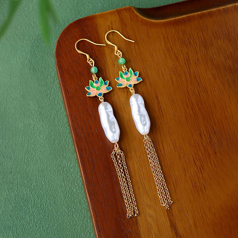 彤彤兔 中国风好运莲莲巴洛克仿异形珍珠耳环S925银针小众流苏耳饰