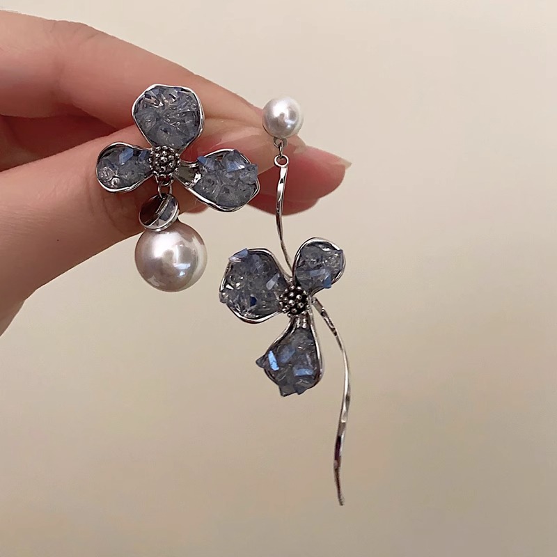 彤彤兔 S925银针不对称蓝色水晶碎石花朵珍珠耳环小众设计感甜美气质耳钉