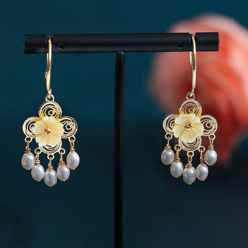 饰瑾美(SHIJINMEI)花朵交叉淡水珍珠耳钉 金色