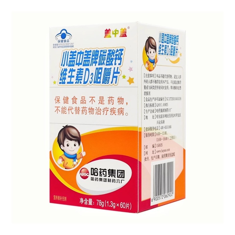 哈药集团小盖中盖牌碳酸钙维生素D3咀嚼片儿童青少年钙片60片保健品