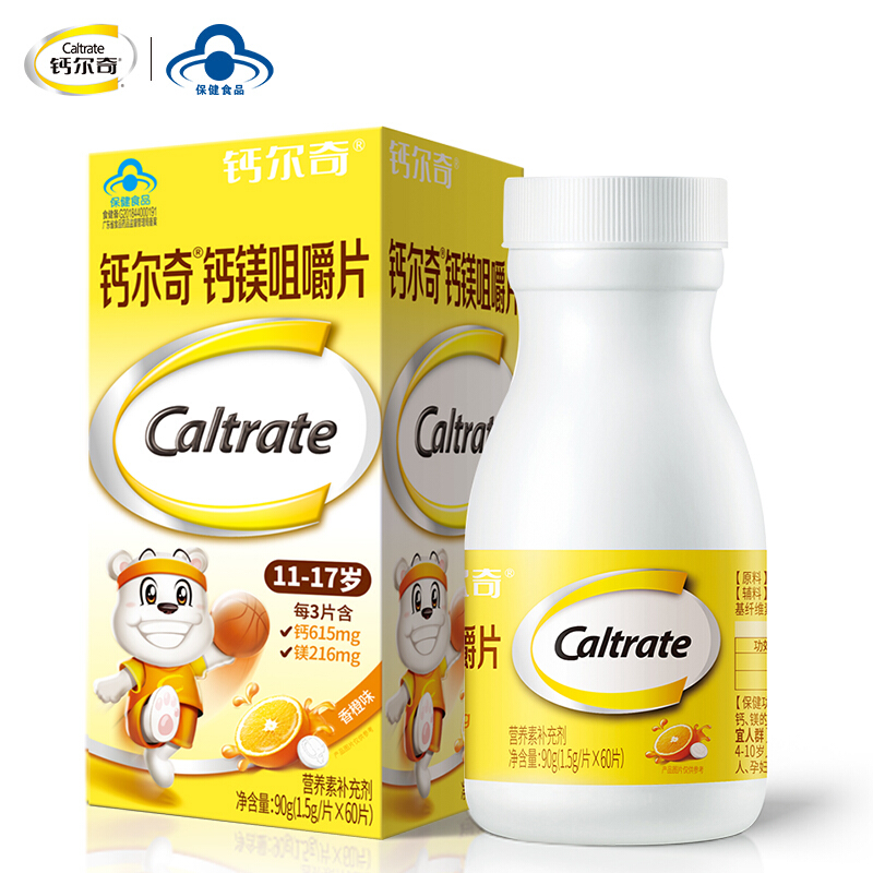 钙尔奇钙镁咀嚼片60片儿童青少年成长钙片维生素d3补钙4-10岁2片-17岁3片双重营养