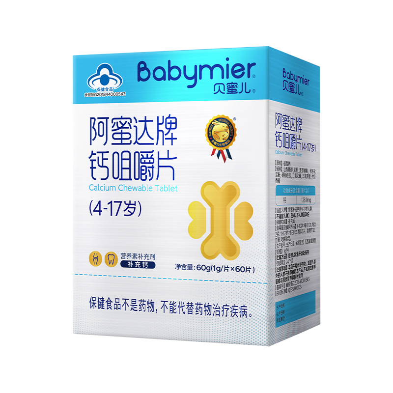 【25年新货】贝蜜儿4-17岁儿童钙咀嚼片少年儿童补钙片碳酸钙奶味60片