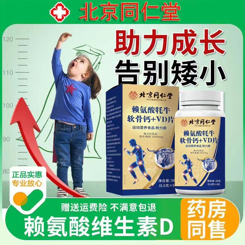 3瓶北京同仁堂赖氨酸牦牛软骨钙VD片维生素D生长素儿童青少年身高增