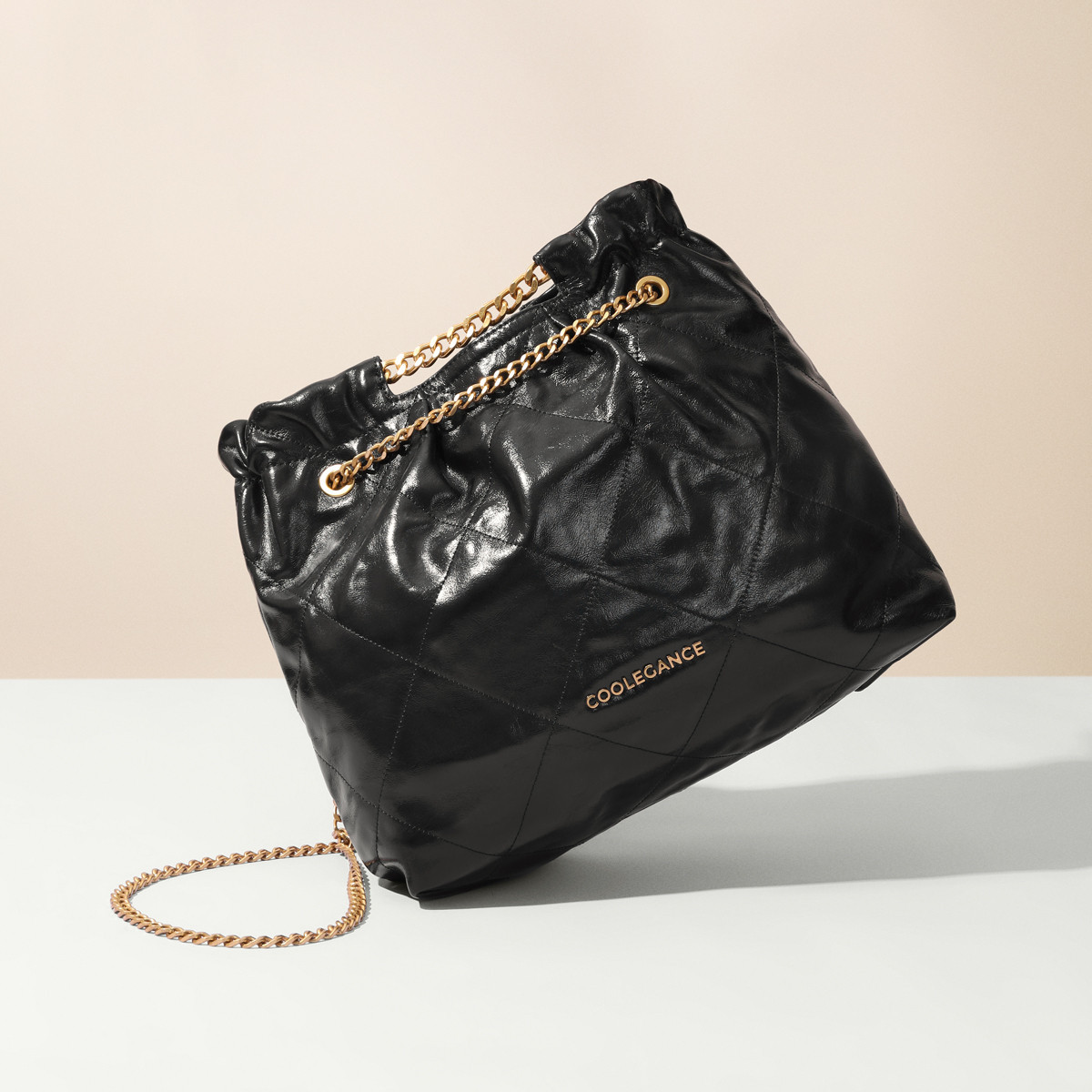 百丽春夏牛皮菱格油蜡皮面垃圾袋包轻奢褶面链条手提托特包 922394