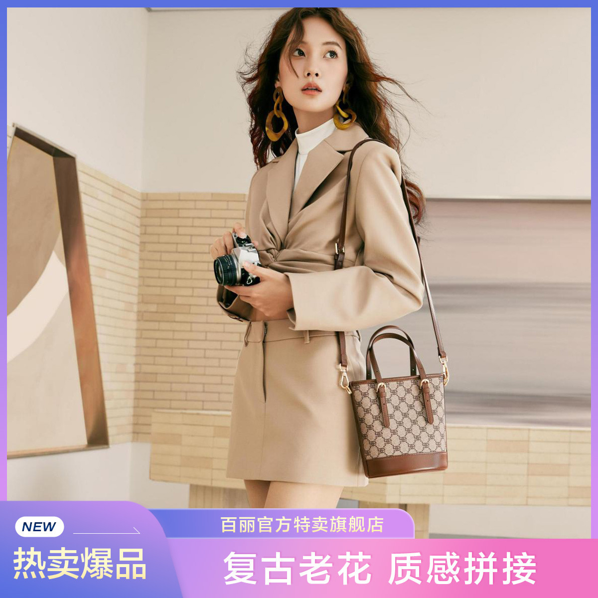 【质感拼色】百丽复古老花手提包商场同款小巧通勤单肩水桶包 209562