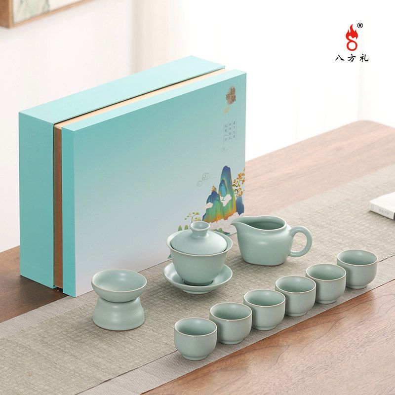 八方礼盖碗10入汝窑茶具套组家用商务汝瓷茶具套装