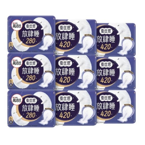 高洁丝 超长夜用卫生巾蚕丝感放肆睡超熟睡组合 放肆睡280mm*8片*3包+420mm*4片*6包