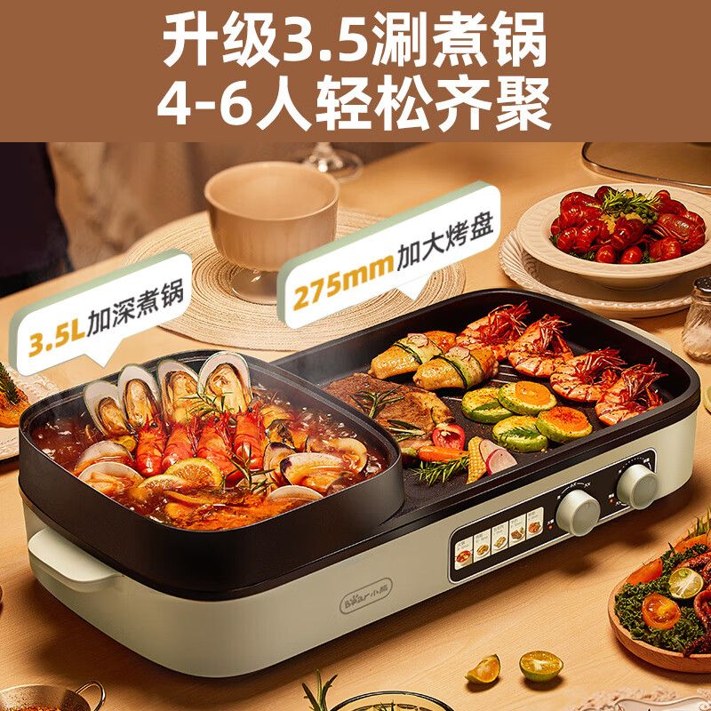 小熊烤涮一体两用锅DKL-E20V1 烤肉火锅电煮锅煎锅 双旋扭分区控温多功能锅电烧烤炉