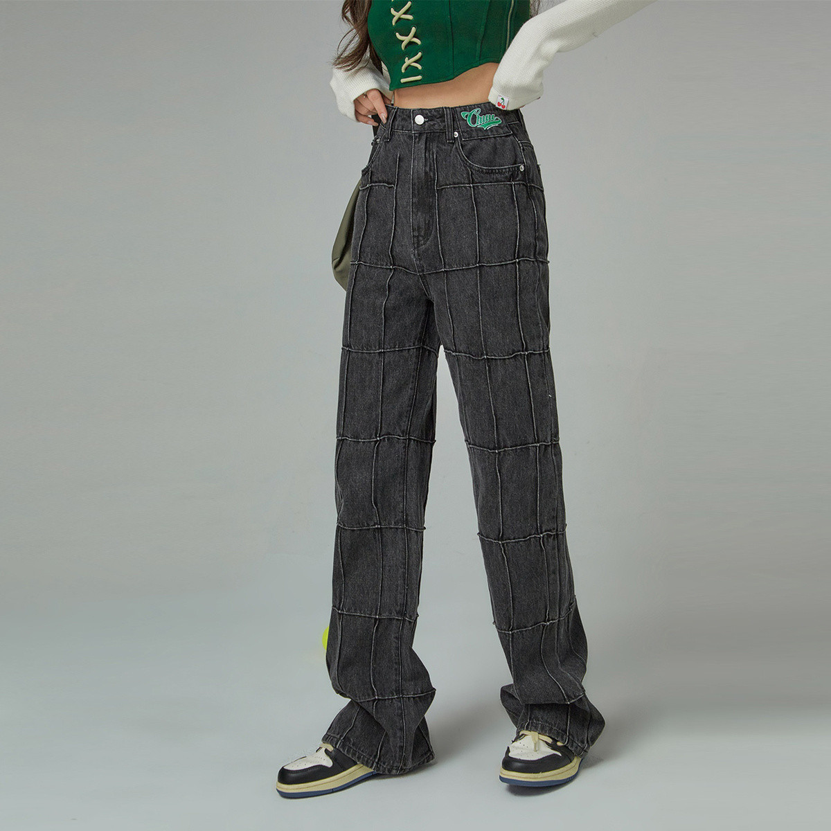 高腰直筒阔腿牛仔裤女春夏秋立体格子长裤子 281299