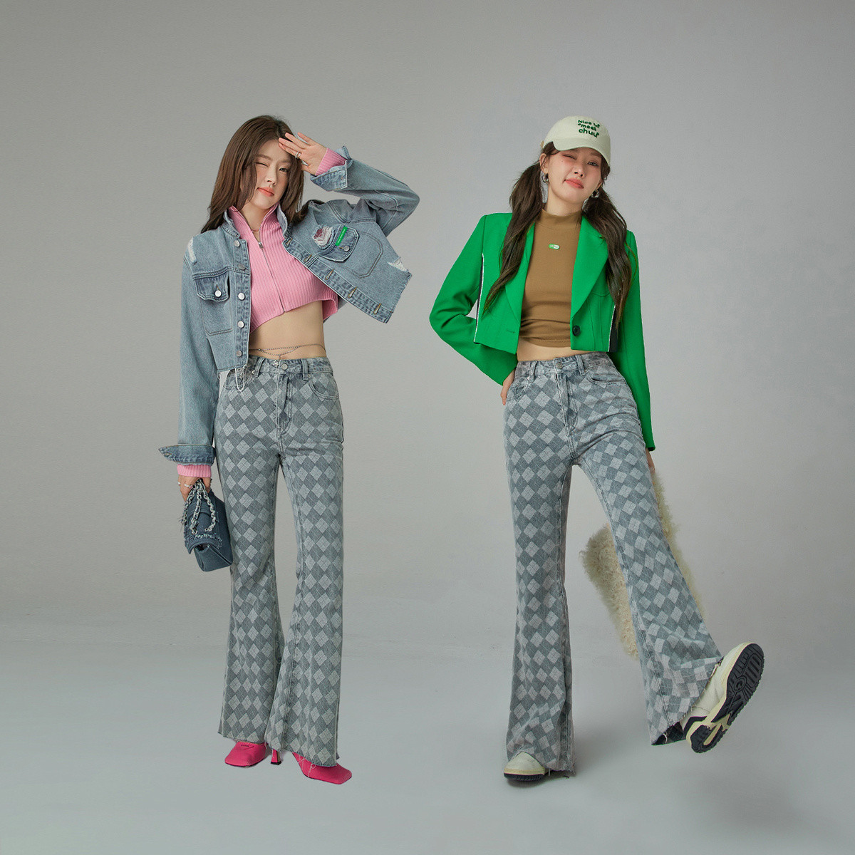 设计感格纹微喇牛仔裤女春秋季时尚显瘦百搭个性长裤子 694995