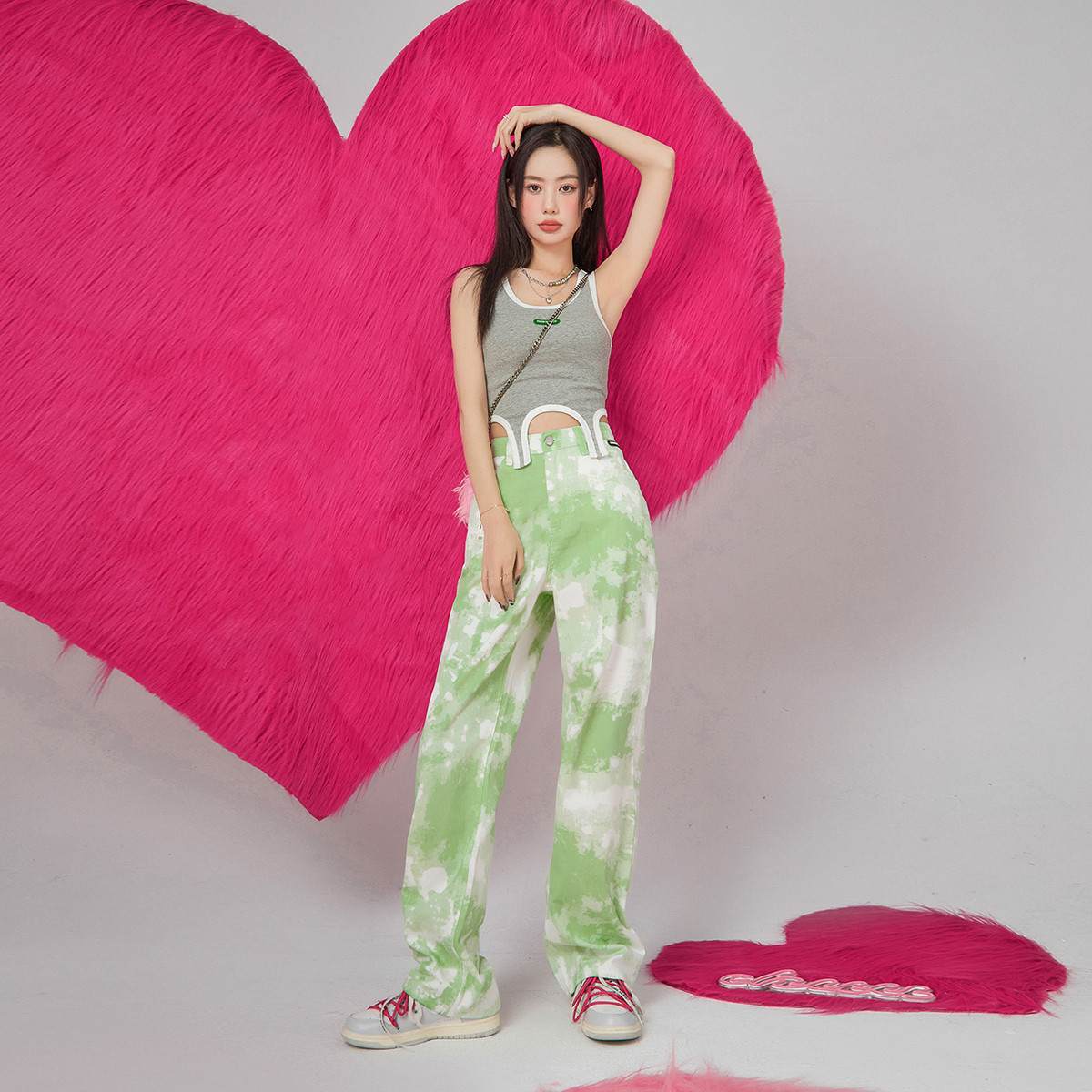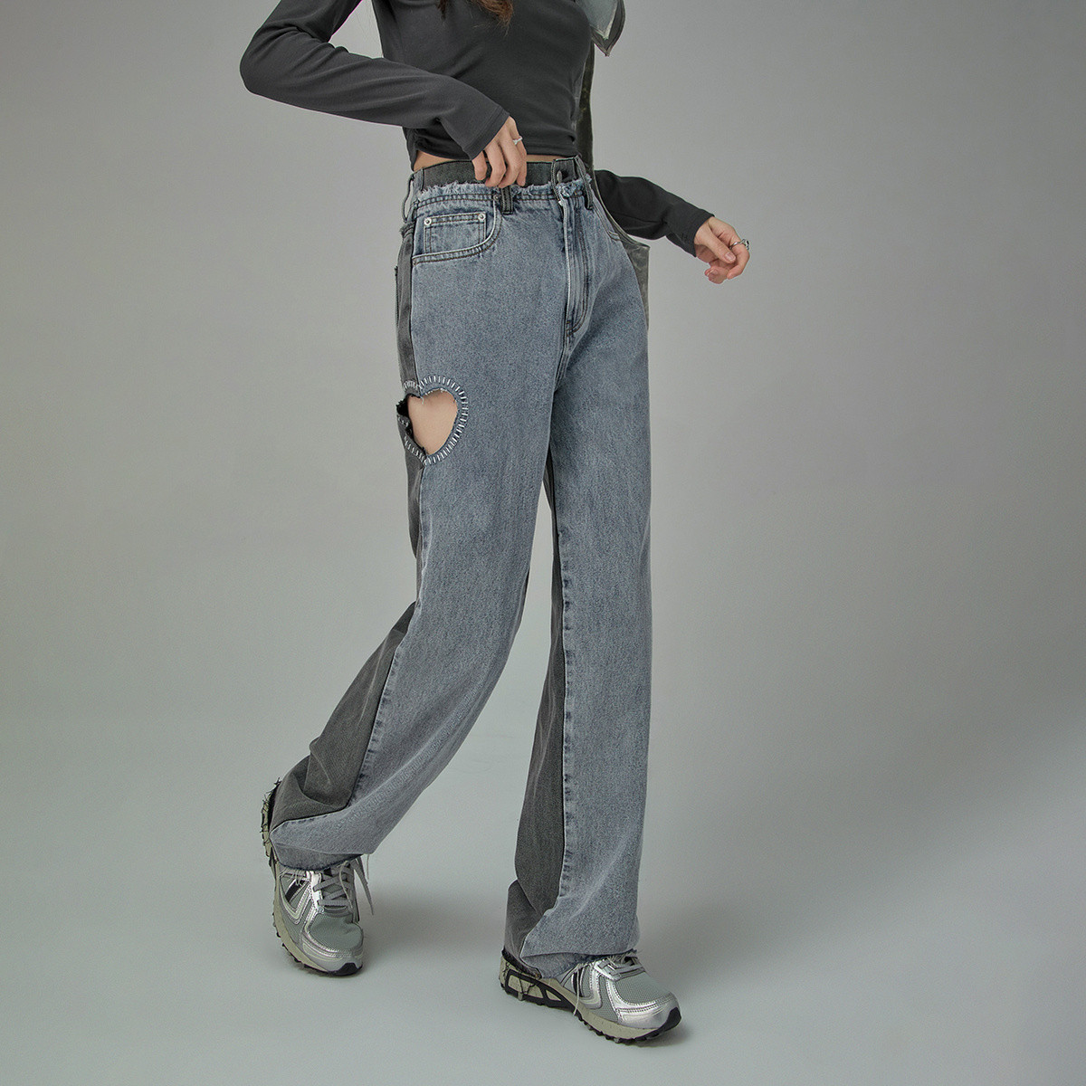 镂空爱心宽松牛仔裤女春秋季设计感小众拼色阔腿裤子 248531