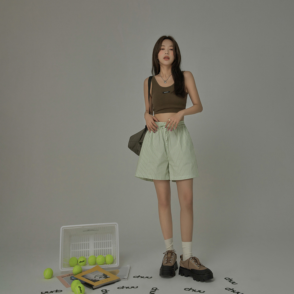 系带松紧腰休闲裤女春夏高腰阔腿条纹辣妹运动短裤 348563